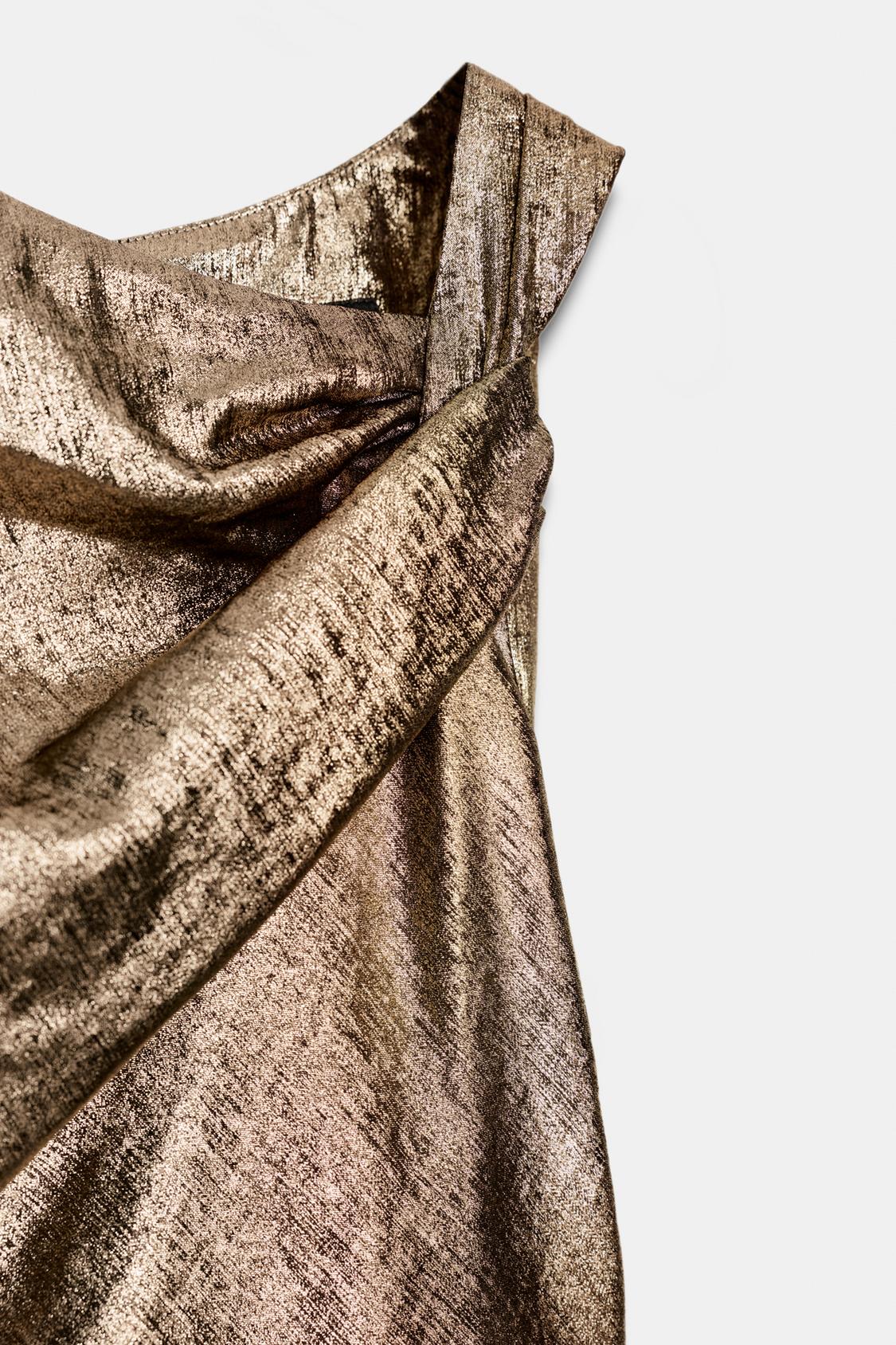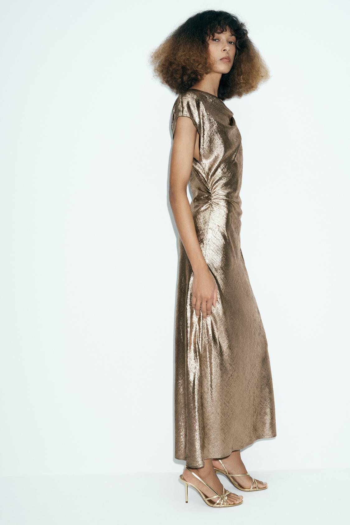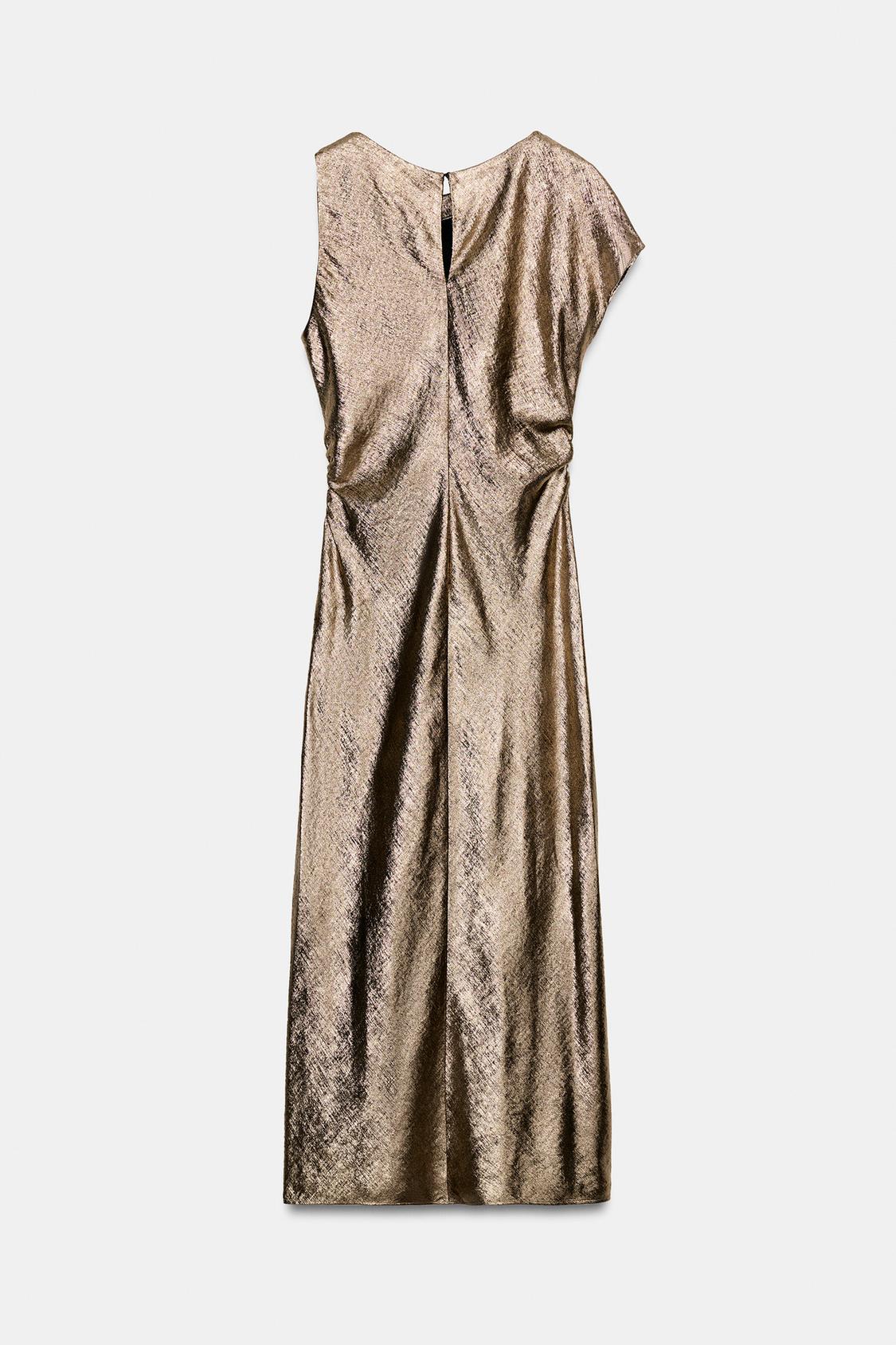فستان بياقة دائرية وكم غير متناسق. خصر مُفصّل وتطريزات درابيه. إغلاق جانبي بسحاب مموه بالخياطة.