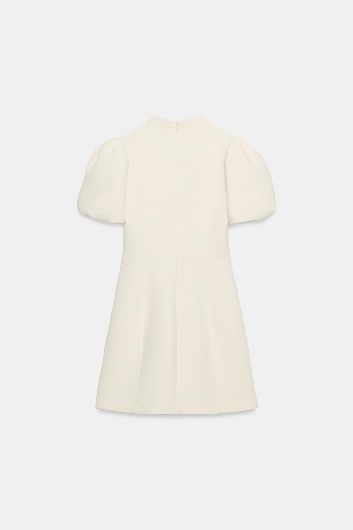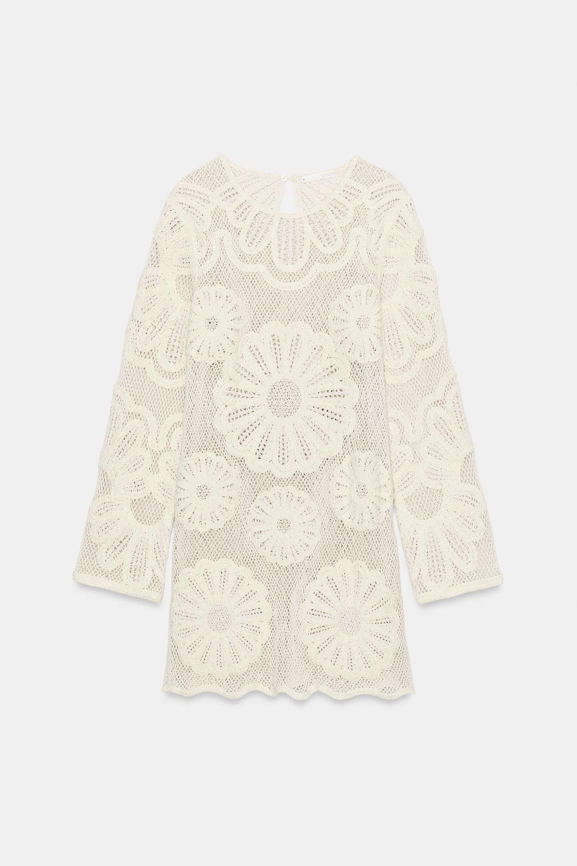 فستان قصير مصنوع من نسيج الكروشيه. ياقة دائرية وأكمام طويلة. حافة سفلية مموجة. إغلاق خلفي بفتحة وزر.