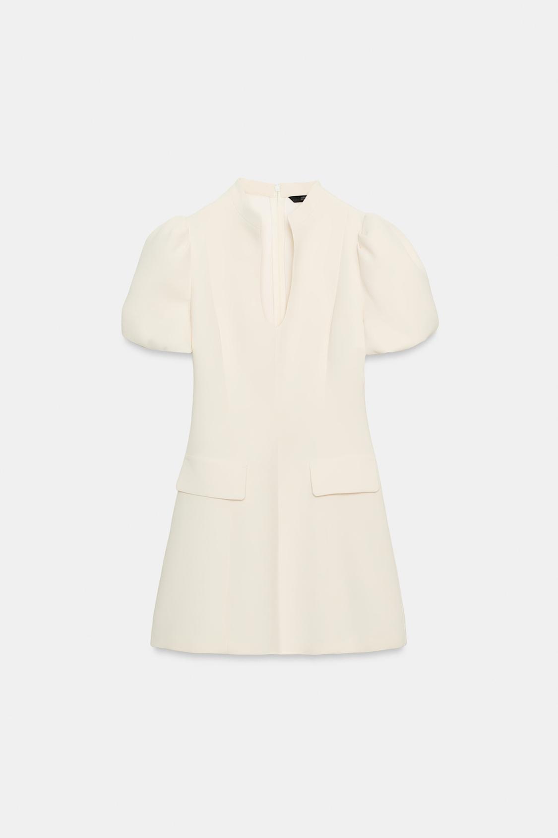 فستان بياقة دائرية مع فتحة صدر على شكل V وأكمام قصيرة منفوخة. خصر محدد. جيوب أمامية بغطاء. إغلاق خلفي بسحاب مخفي في الدرزة.