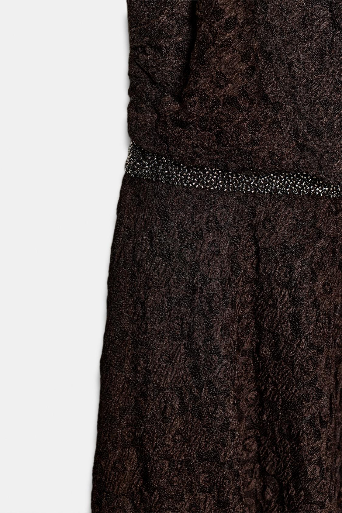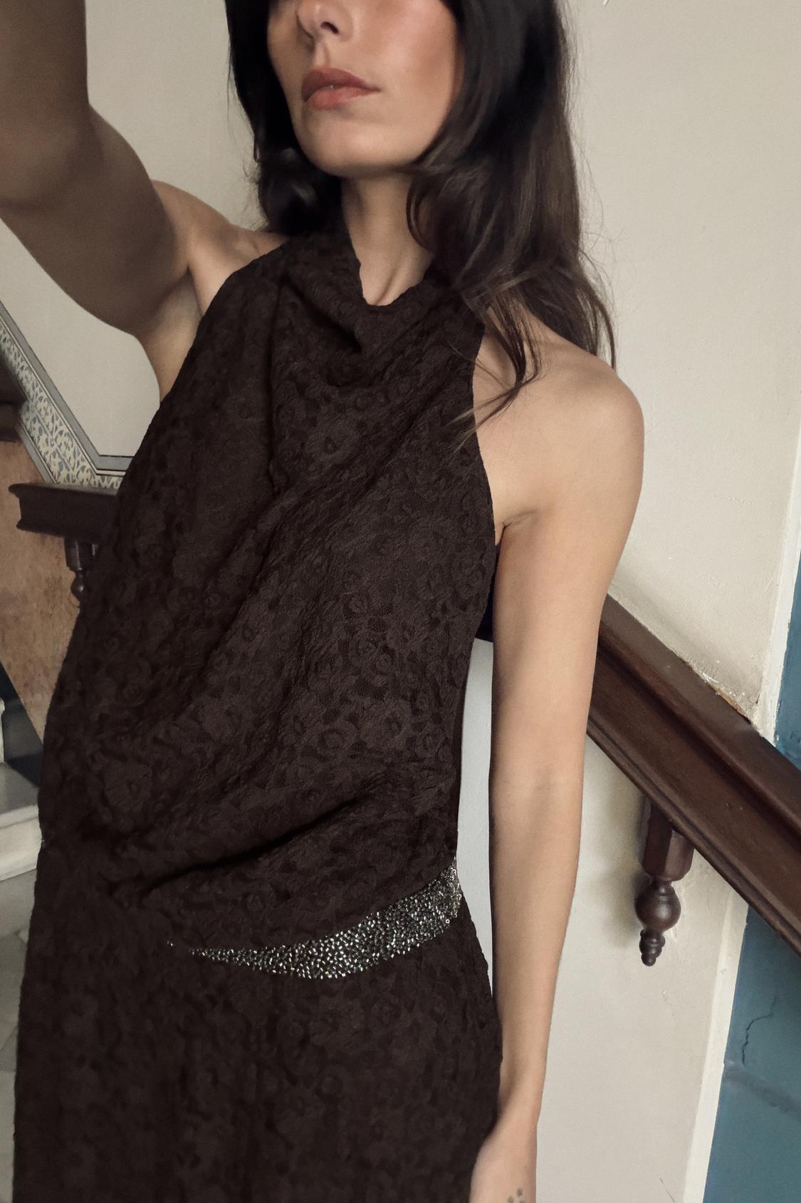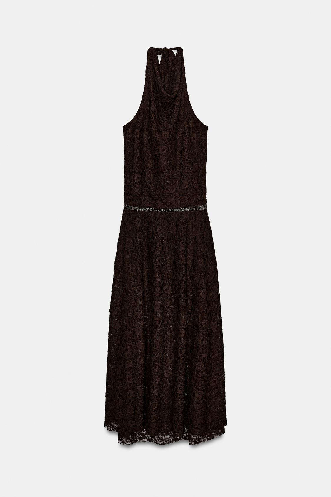 فستان مصنوع من قماش الدانتيل. ياقة هالتر قابلة للتعديل بأربطة. تفصيل خصر مع تطبيق لامع. ظهر مكشوف. حافة سفلية بلمسة نهائية على شكل حرف A.