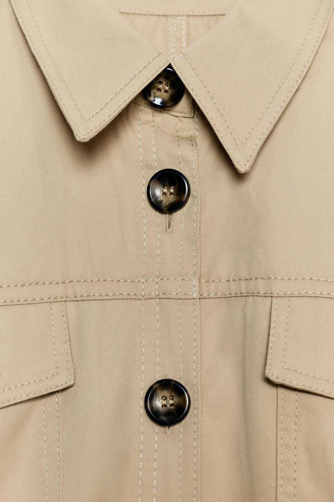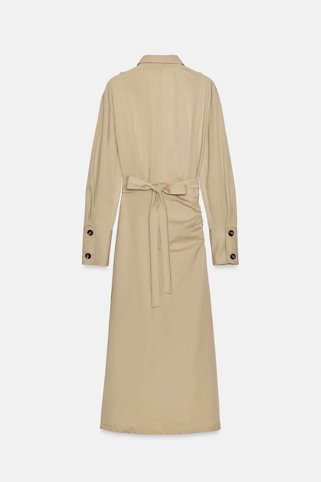 فستان ميدي بياقة مطوية. أكمام طويلة تنتهي بأساور مع حلقات على الكتف. جيب رقعة على الصدر. تنورة بنمط الباريو مع ربطة جانبية. إغلاق أمامي بأزرار.