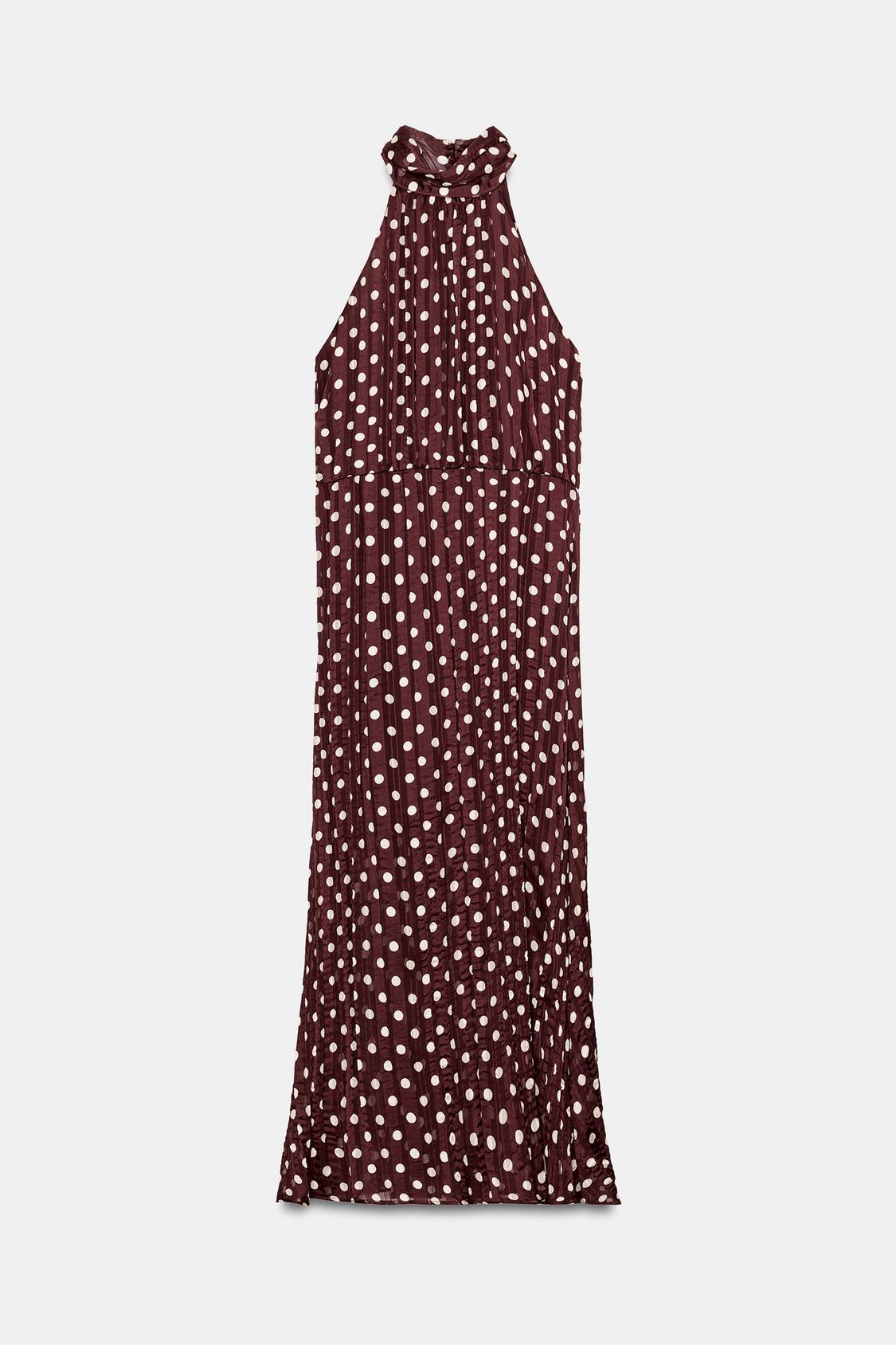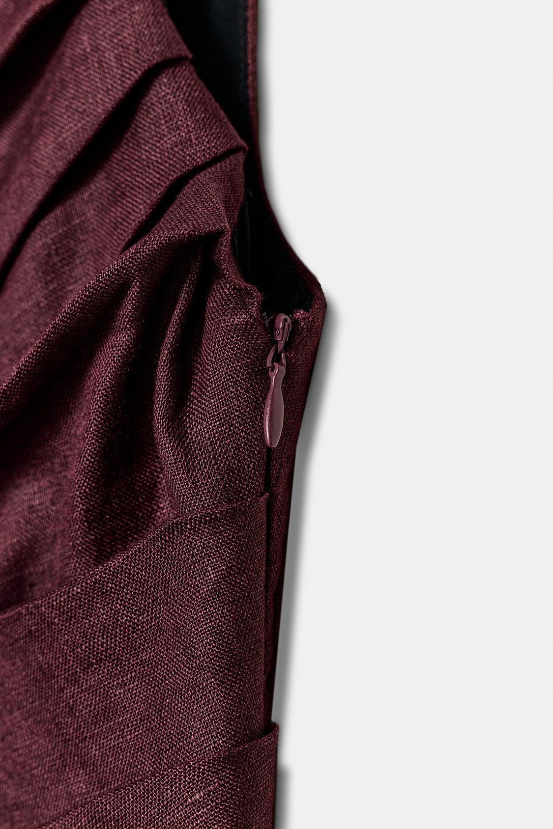 فستان بياقة هالتر مع قماش بتأثير مجعد. بطانة داخلية. إغلاق خلفي بسحاب مخفي في الخياطة وأزرار مخفية.