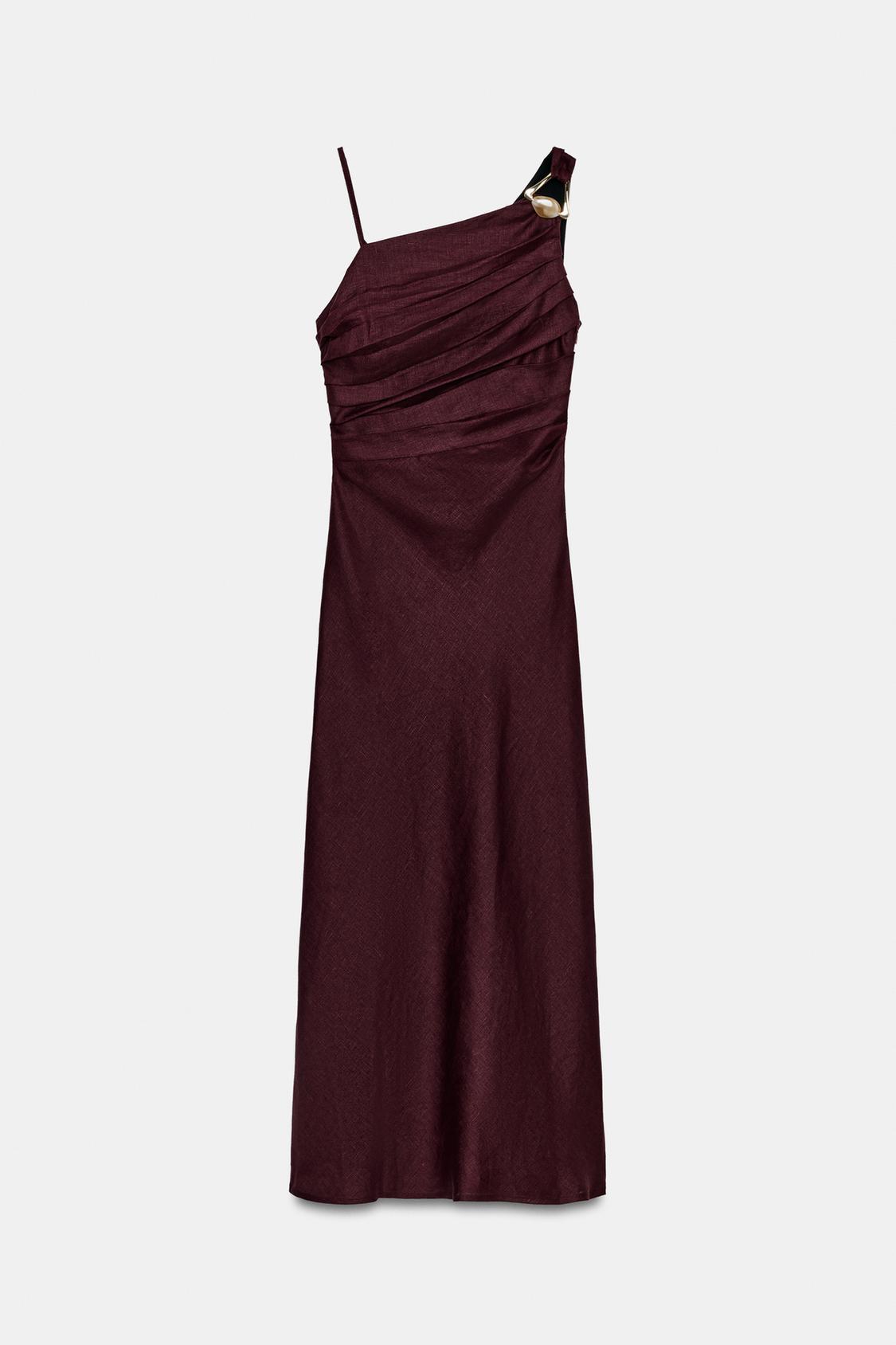 فستان بنسيج أساسي مصنوع 100% من خيوط الكتان. فتحة صدر وحمالات غير متناسقة مع تطعيم ذهبي. تفصيل ثنيات أمامية. بطانة داخلية. إغلاق جانبي بسحاب مخفي في الخياطة.